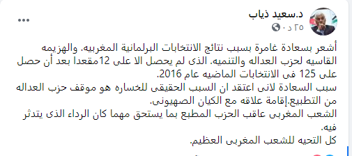أشعر بسعادة غامرة بسبب نتائج الانتخابات البرلمانية المغربيه. والهزيمه القاسيه لحزب العدالة والتنميو. الذى لم يحصل الا على 12مقعدا بعد أن حصل على 125 فى الانتخابات الماضيه عام 2016.