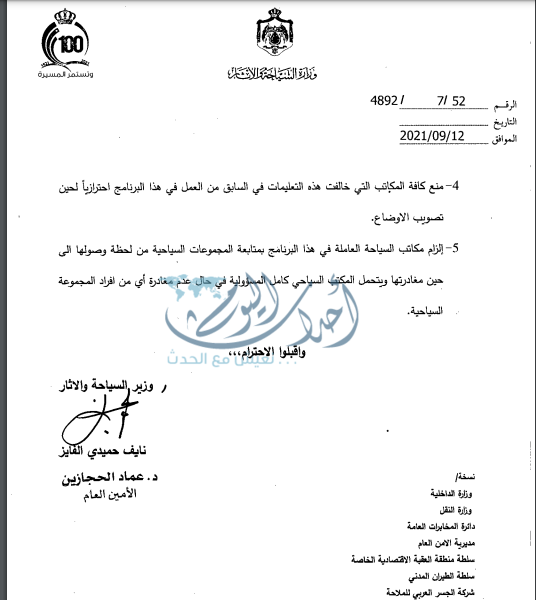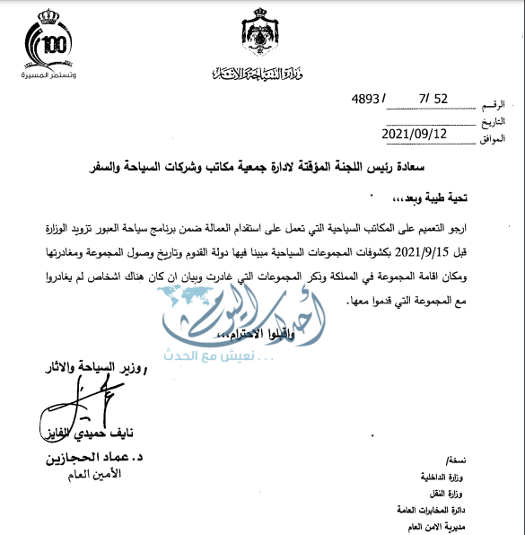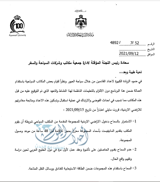 ووفقاً لكتاب وصل "أحداث اليوم" موجه من وزارة السياحة للجنة المؤقته لإدارة مكاتب وشركات السياحة والسفر، فان تقرر إعتبارا من 15/9/2021، الإستمرار بالسماح لدخول الأراضي الأردنية للمجموعة المقدمة من المكتب السياحي شريطة أن يقوم المكتب بتقديم" المانيفيست" باسماء المجموعة، معززاً بحجز للاقامة قبل 48 ساعة من موعد وصول المجموعة.