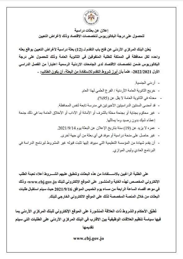 أحداث اليوم - أعلن البنك البنك المركزي الأردني عن فتح باب التقدم لـ12 بعثة دراسية لأغراض التعيين بواقع بعثه واحدة لكل محافظة في المملكة للطلبة المتفوقين في الثانوية العامة؛ للحصول على درجة البكالوريوس ضمن تخصصات الاقتصاد لدى الجامعات الأردنية الرسمية اعتباراً من الفصل الدراسي الأول 2021/2022.