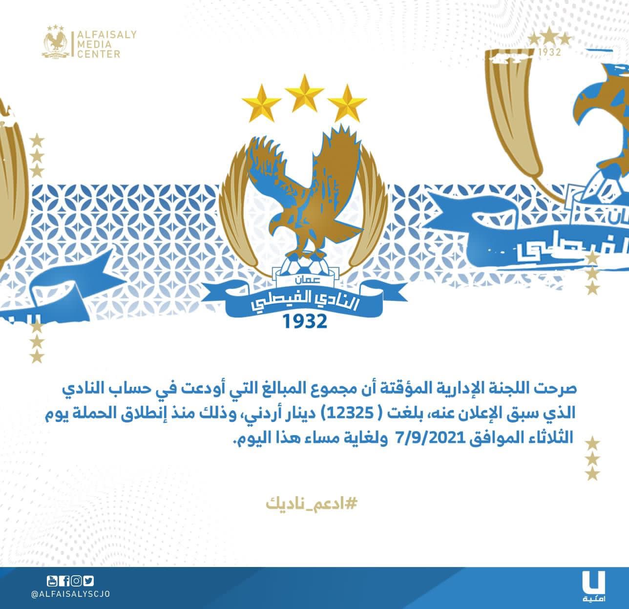 أحداث اليوم - صرحت اللجنة الادارية المؤقتة في النادي الفيصلي أن مجموع المبالغ التي اودعت في حساب النادي الذي سبق الاعلان عنه بلغت 12 الف و325 دينار اردني. وذلك من انطلاق الحملة يوم الثلاثاء الموافق 7/9/2021 ولغاية مساء هذا اليوم.