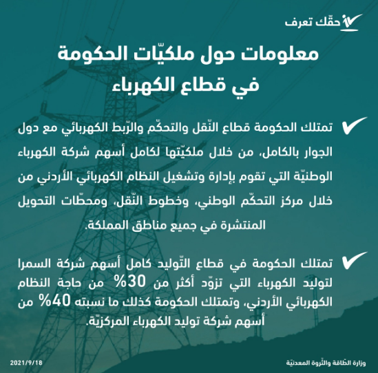 نشرت الحكومة من خلال منصة "حقك تعرف" تفاصيل ملكياتها في قطاع الكهرباء .