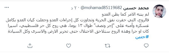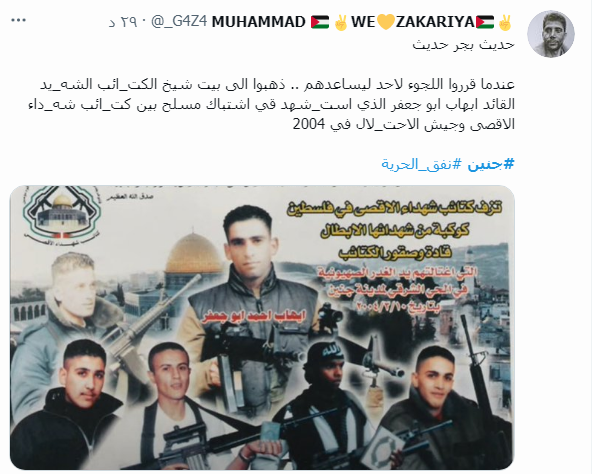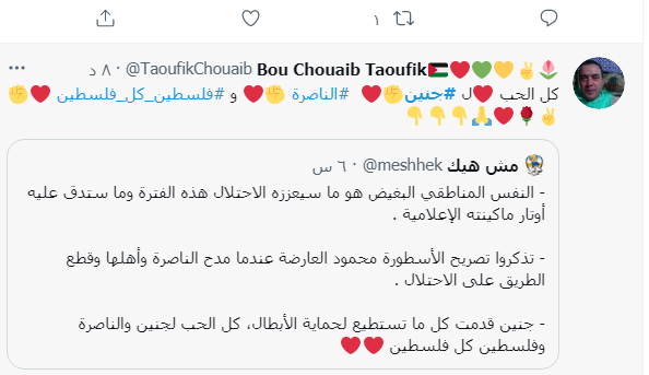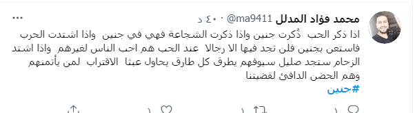 واضافوا انه اذا ذكر الحب ذُكرت جنين واذا ذكرت الشجاعة فهي في جنين واذا اشتدت الحرب فاستعن بجنين فلن تجد فيها الا رجالا عند الحب هم احب الناس لغيرهم واذا اشتد الزحام ستجد صليل سيوفهم يطرق كل طارق يحاول عبثا الاقتراب لمن يأتمنهم وهم الحضن الدافئ لقضيتنا .