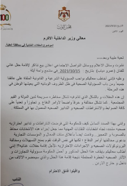 إنني أطالب معاليكم بإيقاف هذا الحفل المذكور و أحمل الحكومة مسؤولية التجاوزات و الآثار الصحيه الخطرة المحتملة نتيجة إقامة هذا الحفل والذي سيحضره الالاف من داخل و خارج الاردن .