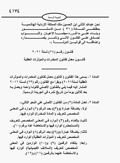 أحداث اليوم - صدر في عدد الجريدة الرسمية اليوم الخميس الارادة الملكية السامية بصدور القانون المعدل لقانون المخدرات والمؤثرات العقلية.