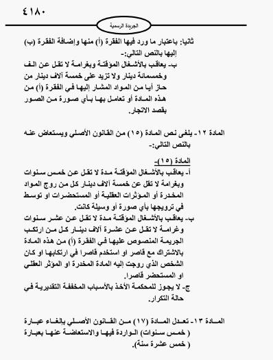 وبموجب القانون المعدل لا يعتبر تعاطي أو إدخال أو جلب أو تهريب أو استيراد أو تصدير أو إخراج أو إحراز أو شراء أو تسليم أو نقل أو انتاج أو صنع أو تخزين أو زراعة أيا من المواد المخدرة والمؤثرات العقلية أو المستحضرات أو النباتات التي ينتج منها مواد مخدرة أو مؤثرات عقلية بقصد تعاطيها أي سابقة جرمية أو قيدا أمنيا بحق مرتكبه للمرة الأولى.