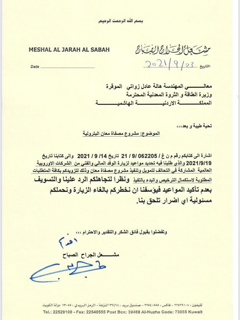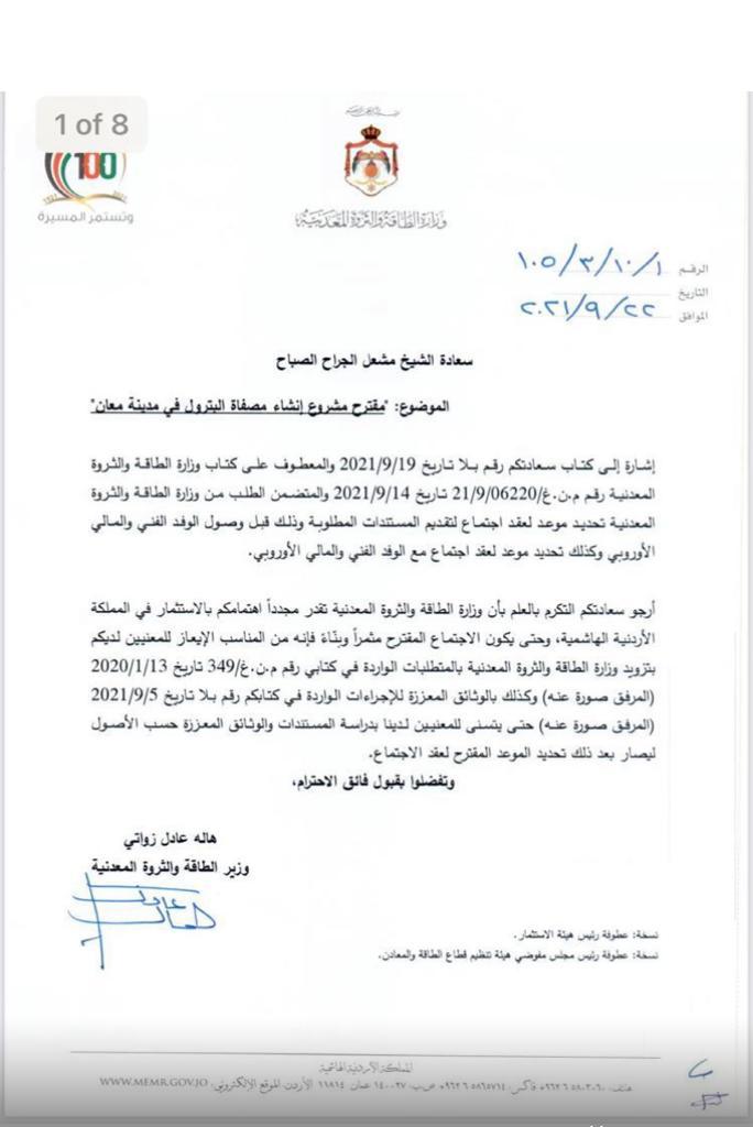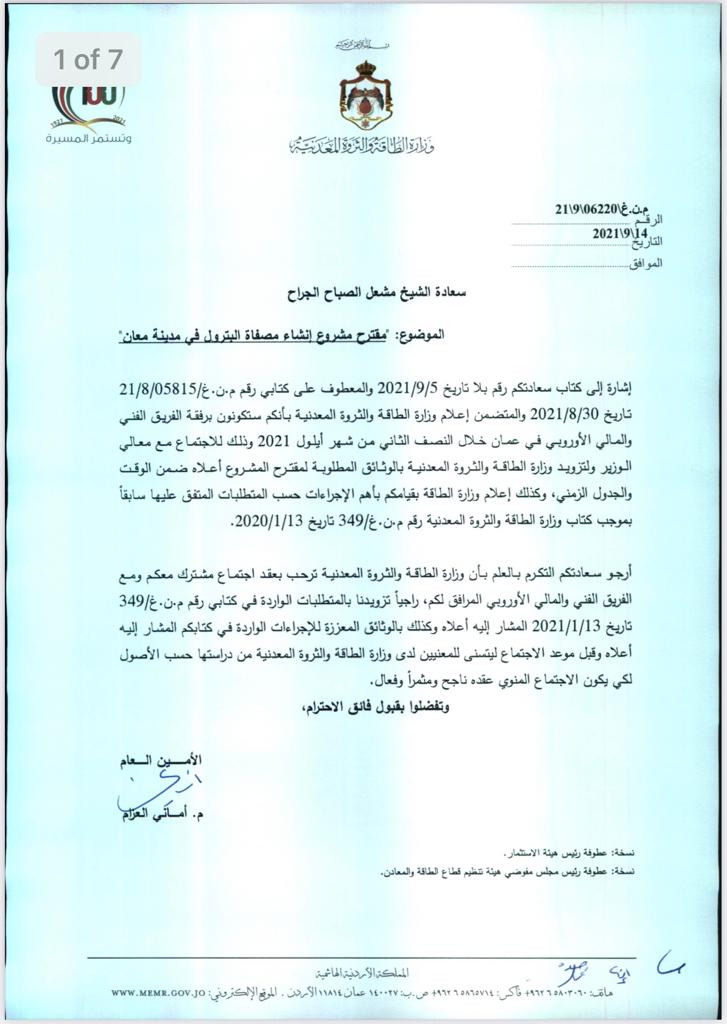 أحداث اليوم - رحبت وزارة الطاقة والثروة المعدنية بطلب المستثمر الكويتي مشعل الصباح عقد اجتماع معه والفريق الفني والمالي الأوروبي المرافق له، لبحث مقترح مشروع إنشاء مصفاة بترول في مدينة معان.