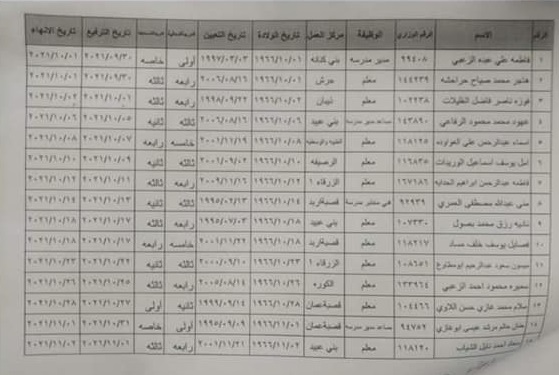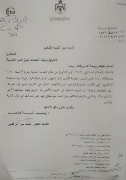 أحداث اليوم - قرر وزير التربية والتعليم محمد أبو قديس، ترفيع عدد من الموظفين وإنهاء خدماتهم لبلوغهم السن القانوني.وجاء القرار استنادا لأحكام المادتين (أ/173) و(79/ب) من نظام الخدمة المدنية رقم 9 لسنة 2020 وتعديلاته.وتاليا التفاصيل: