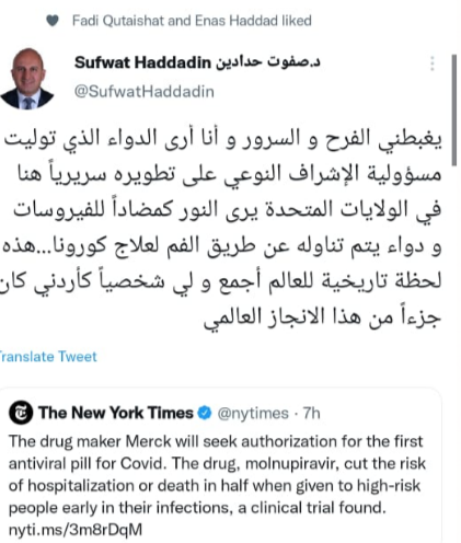 وقال حدادين، في تغريدة له عبر حسابه الرسمي على تويتر: "يغبطني الفرح و السرور و أنا أرى الدواء الذي توليت مسؤولية الإشراف النوعي على تطويره سريرياً هنا في الولايات المتحدة يرى النور كمضاد للفيروسات و دواء يتم تناوله عن طريق الفم لعلاج كورونا".