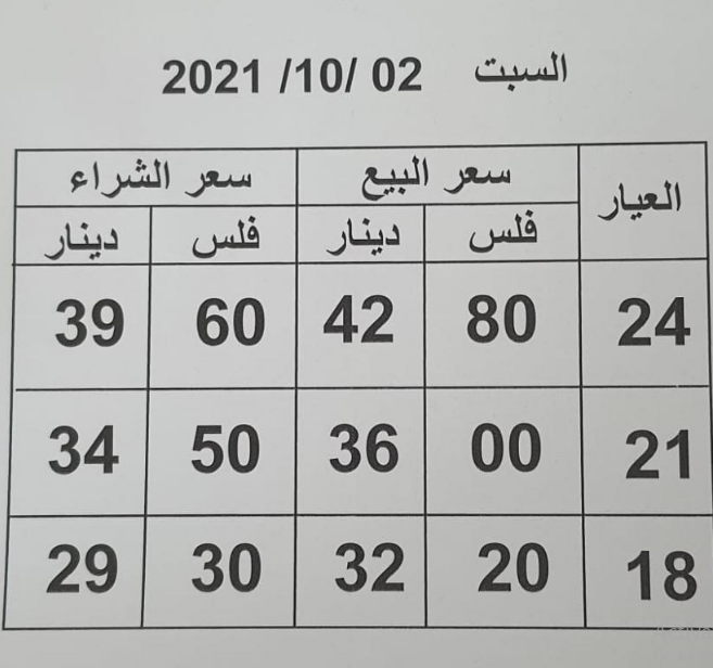 وبلغ سعر بيع الغرام من الذهب عياري 24 و18 لغايات الشراء من محلات الصاغة عند 42.8 و32.2 دينارا على التوالي.