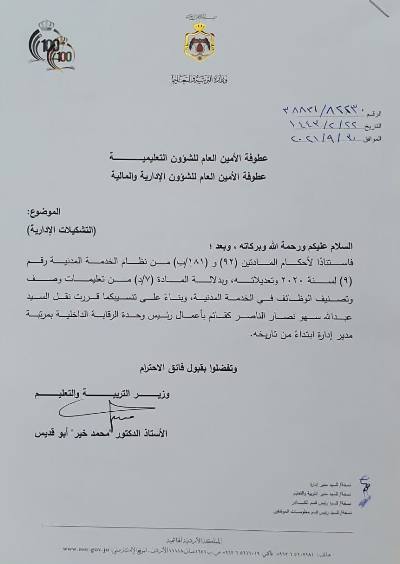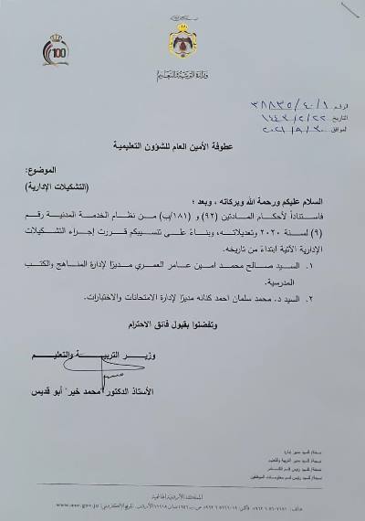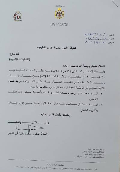 كما تم تعيين صالح العمري مديرا لدائرة المناهج وتعيين عبدالله سهو الناصر قائم باعمال وحدة الرقابة الداخلية بمرتبة مدير ادارة و تعيين ختام عبابنة قائم بأعمال مدير ادارة الاشراف والتدريب التربوي.