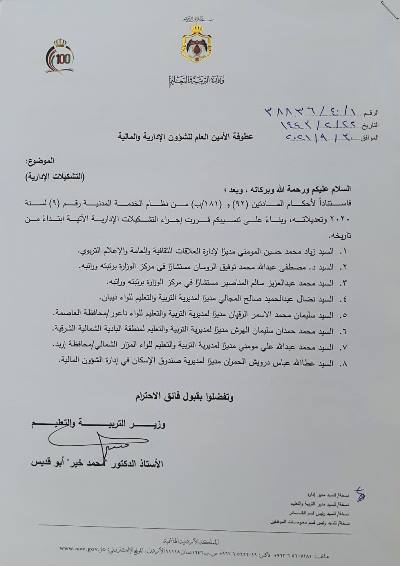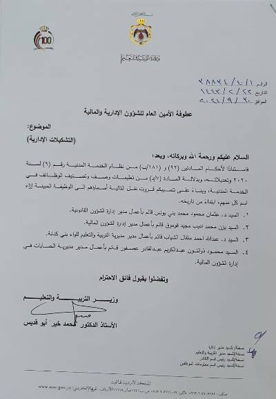 وجرى تعيين عثمان بني يونس قائم باعمال مدير ادارة الشؤون القانونية وتعيين يزن قوموق قائم بأعمال مدير ادارة الشؤون المالية وتعيين محمود عصفور قائم باعمال مدير مديرية الحسابات في ادارة الشؤون المالية وتعيين زياد المومني مديرا لادارة العلاقات الثقافية والعامة والاعلام التربية، اضافة الى عدد من مدراء المديريات في الميدان.
