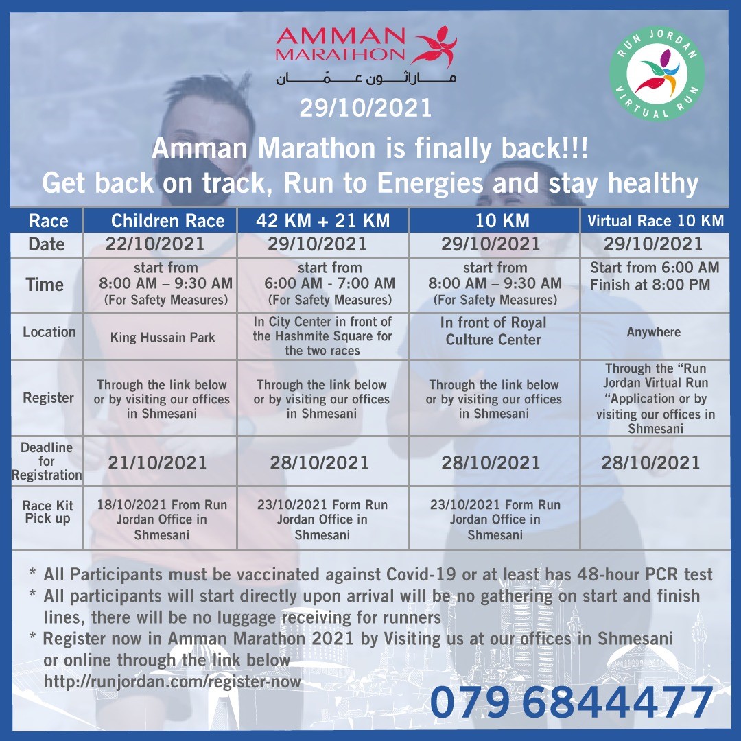 حيث يعد الماراثون السنوي حدثاً رياضياً مهماً على المستويين المحلي والدولي، ويأتي تأكيداً على الإستمرار في نهج الجمعية الأردنية للماراثونات Run Jordan إلى رفعالوعيالمجتمعيبأهميةالرياضة وإتباع نظام حياة صحية أفضل. ونظراً للظروف المحيطة بالمجتمع والمرتبطة بتفشي فايروس كورونا، فقد تم إعداد خطة خاصة لإقامة الحدث وفق متطلبات الصحة العامة والمتوافقة مع لجنة الأوبئة في وزارة الصحة، حيث يتطلب من الراغبين بالمشاركة في الماراثون إبراز شهادة تلقي اللقاح (شهادة مطعوم كوفيد – 19) أو مضي 21 يوم بحد أدنى على أخذ الجرعة الأولى من اللقاح، و في حال عدم تلقي الراغبين في التسجيل للقاح الأول و الثاني، فأنه يترتب عليهم إجراء فحص (PCR) سلبي خلال فترة ٤٨ ساعةقبل موعد السباقليتسنى لهم المشاركة.