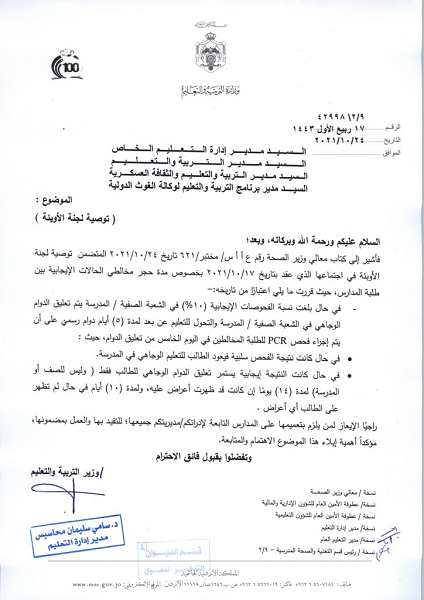 وبيّن الكتاب أنه في حال كانت نتيجة فحص سلبية فيعود الطالب للتعليم الوجاهي في المدرسة، بينما إذا كانت النتيجة إيجابية يستمر تعليق الدوام الوجاهي للطالب فقط وليس للصف او المدرسة لمدة 14 يوما إن كانت قد ظهرت عليه الأعراض ولمدة 10 أيام في حال لم تظهر على الطالب أية أعراض