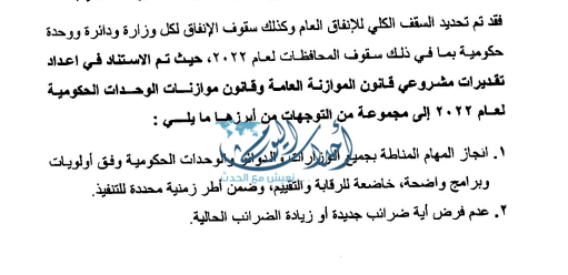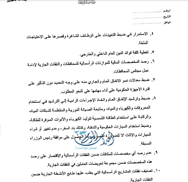 وجاء في نص البلاغ، الذي اطلعت عليه "احداث اليوم" عدم التعيين على حساب المشاريع الرأسمالية بما في ذلك شراء الخدمات وحصر ذلك في الحالات المبررة فقط.