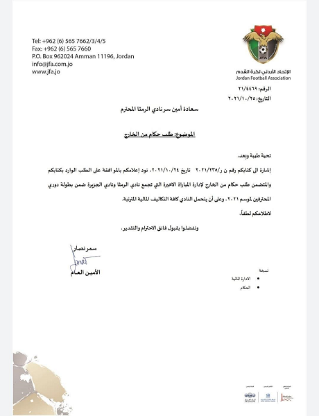 وكشف نادي الرمثا من خلال كتاب رسمي وجهه اتحاد الكرة لنادي الرمثا، يتضمن من خلاله تحميل النادي التكاليف المادية لجلب الحكام الأجانب.