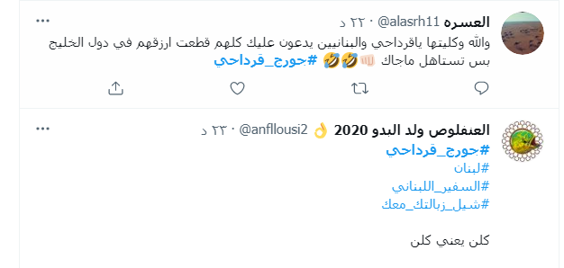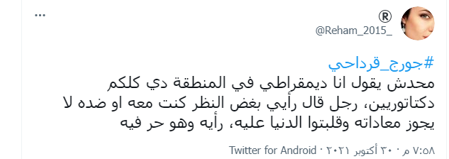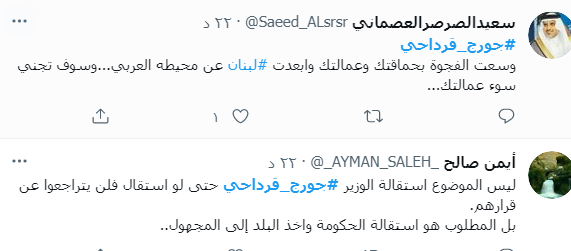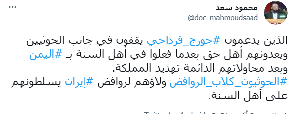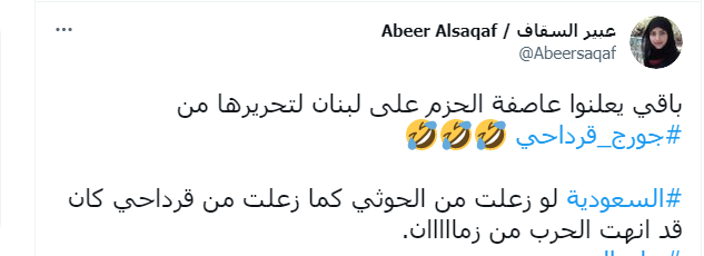وتداول المغردون على نطاق واسع وسم #جورج_قرداحي، عقب تصريحات تحدث فيها عن موقفه من الحرب على اليمن، قبل أن يصبح وزيرا في حكومة نجيب ميقاتي.