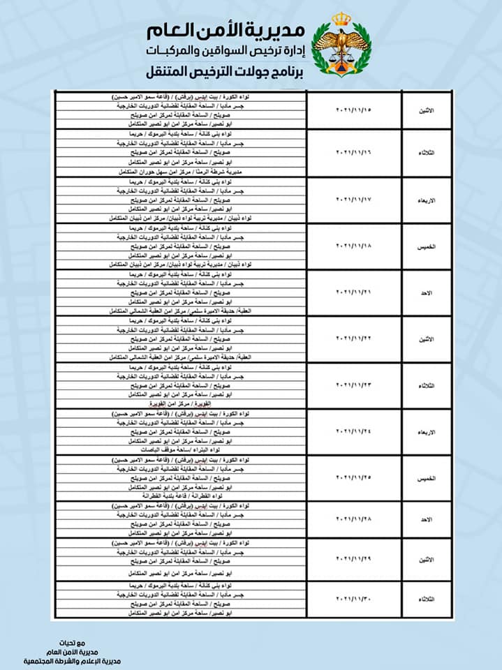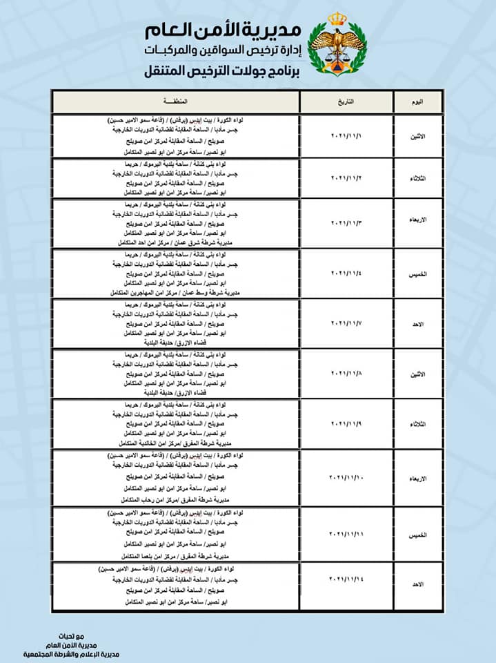 أحداث اليوم - أعلنت إدارة ترخيص السواقين والمركبات عن مواعيد العمل بجولات الترخيص المتنقل ضمن المبادرة الابتكارية (بنوصلك) خلال شهر تشرين الثاني في عدد من مناطق المملكة.