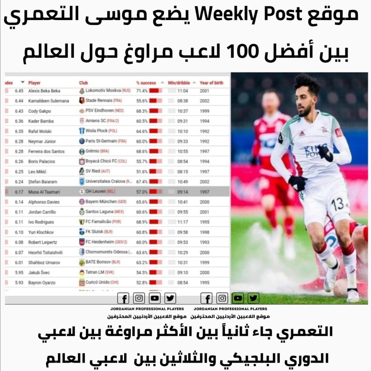أحداث اليوم - وضع تقرير أعده موقع weekly post العالمي لاعب منتخب النشامى موسى التعمري بين أفضل 100 لاعب على العالم من حيث عدد المراوغات الناجحة منذ بداية الموسم.