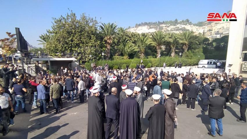 وبدأت مراسم التشييع من مشفى الشامي في دمشق، عند الساعة التاسعة بالتوقيت المحلي مرورا بساحة الأمويين وصولا إلى جسر الثورة باتجاه مدينة حلب، وسيتقبله أهل "الشهباء" وبعد أداء صلاة الجنازة عليه في جامع عبد الله بن عباس، عصر الخميس، ليوارى الثرى بـ"المقبرة الحديثة" بحلب.