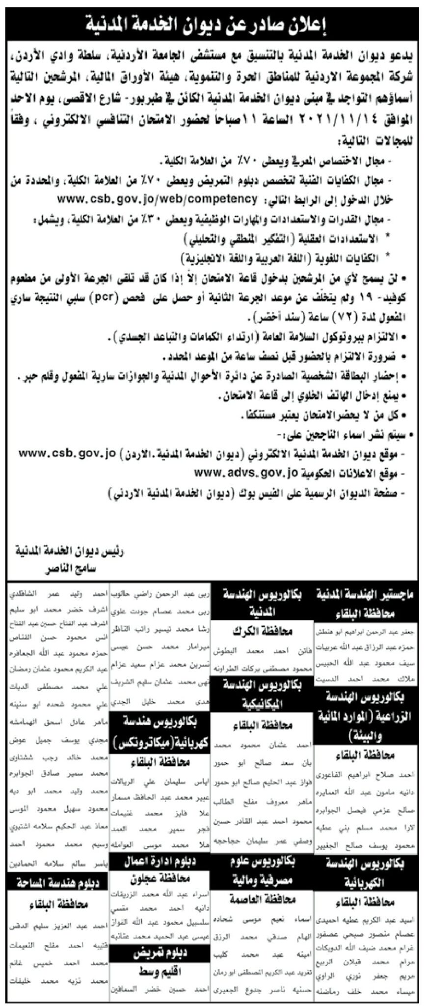 أحداث اليوم - دعا ديوان الخدمة المدنية وبالتنسيق مع مستشفى الجامعة الأردنية، وسلطة وادي الأردن، وشركة المجموعة الأردنية للمناطق الحرة والتنموية، وهيئة الأوراق المالية، مرشحين، لحضور الامتحان التنافسي الإلكتروني.