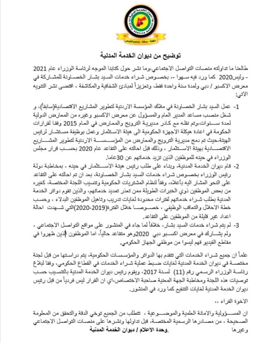 وقام ديوان الخدمة بمخاطة رئيس الوزراء حول شراء خدمات بشار الخصاونة ، بد ان تم احالته الى التقاعد ، ولم يتم شراء الخدامات ، ولم يشارك في معرض اكسبو دبي ، والموظفين الذين ظهروا في الفيديو ليسوا من موظفي القطاع الحكومي.