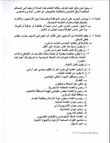 وكذلك لتوسيع تمثيل الأحزاب للمجتمع الأردني وتحفيز الأردنيين على تشكيل أحزاب سياسية برامجية، والمشاركة فيها بحرية وفاعلية، وتعزيز الدور السياسي للمرأة والشباب والأشخاص ذوي الإعاقة في الحياة الحزبية والعامة.