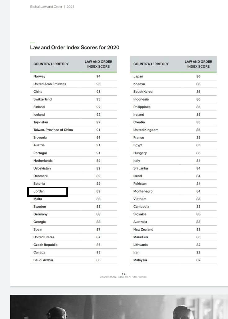 وحقق الأردن قفزة كبيرة في مجال الأمن حسب مؤسسة «غالوب» الدولية للدراسات والأبحاث الأمنية، المختصة برصد مستوى الأمن وسيادة القانون، ومدى الشعور بالأمان.