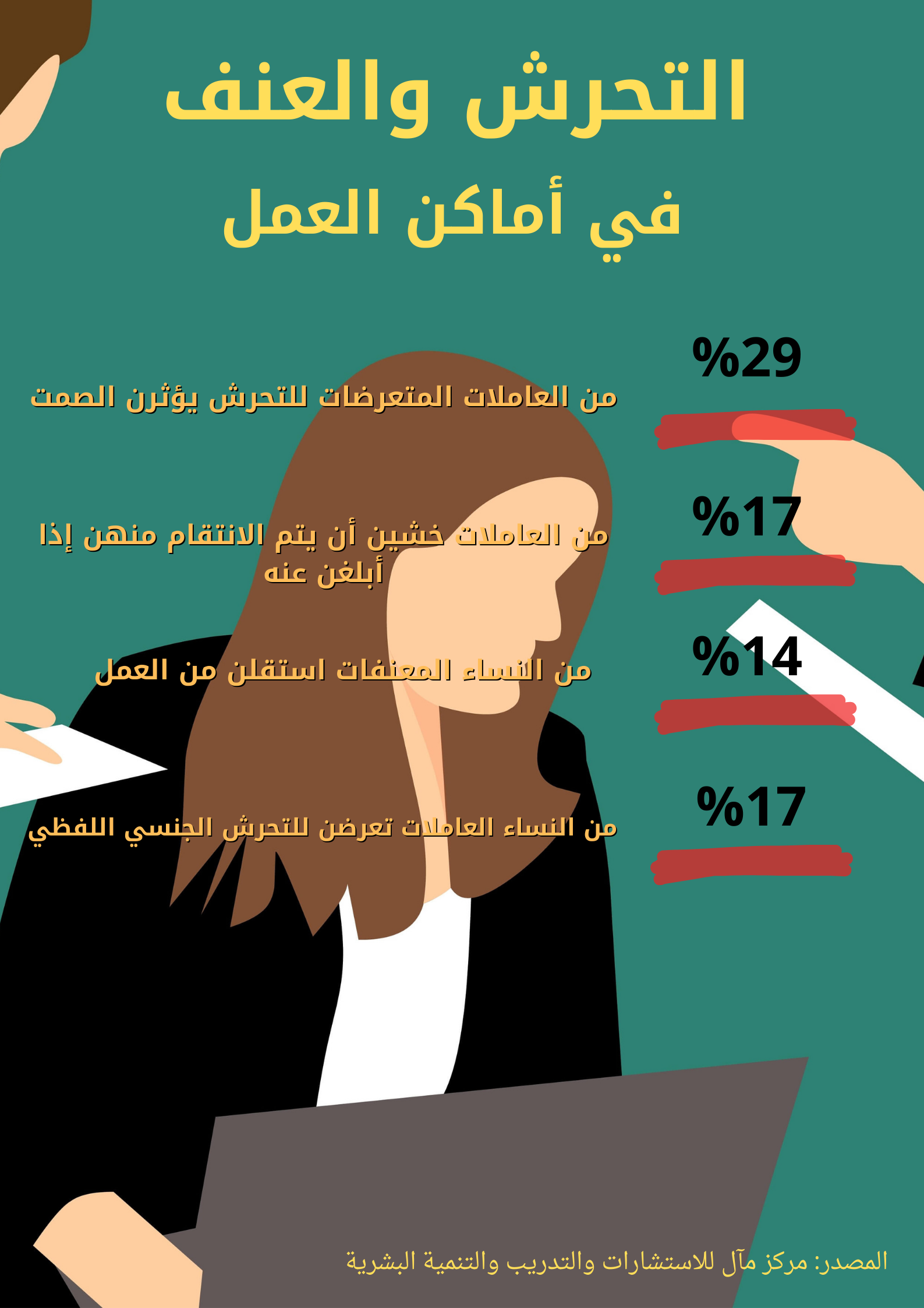 وتشير دراسة أعدها مركز مآل للاستشارات والتدريب والتنمية البشرية حول قصور العدالة للفتيات المتضررات من جراء العنف والتحرش في أماكن العمل إلى أن 29% من النساء التزمن الصمت إزاء العنف والتحرش، فيما خشيت ما نسبته 17% من العاملات أن يتم الانتقام منهن إذا أبلغن عنه، في حين استقالت 14% من النساء المعنفات.