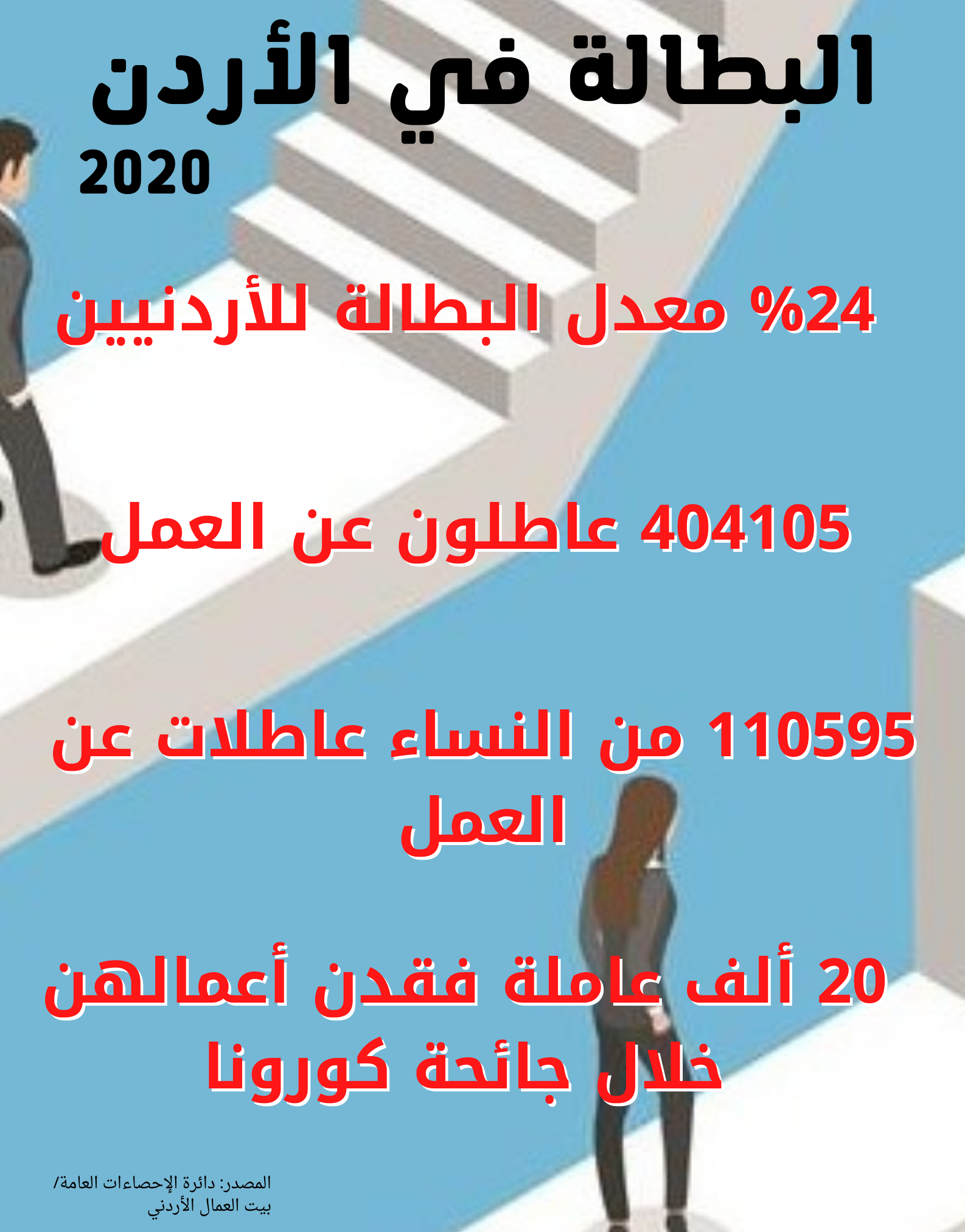 وقدّر عدد المتعطلين عن العمل لعام 2020، 404105 شخصا، من بينهم 110595 أنثى، فيما تسببت جائحة فيروس كورونا المستجد في زيادة ملحوظة على معدل البطالة بين الإناث ليصل إلى 33.6% نسبة الجامعيات منهن 77%، كما فقدت ما يقرب من 20 ألف عاملة فقدن أعمالهن خلال الجائحة، بحسب بيت العمال الأردني.