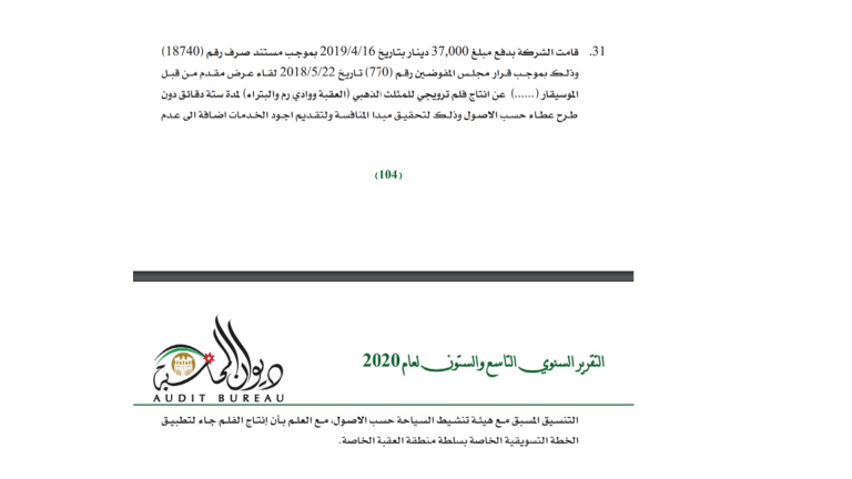كشف تقرير ديوان المحاسبة لعام 2020 بأن شركة تطوير العقبة قامت بصرف 37 ألف دينار لإنتاج فيلم ترويجي للمثلث الذهبي (العقبة ووادي رم والبتراء) ومدته 6 دقائق.