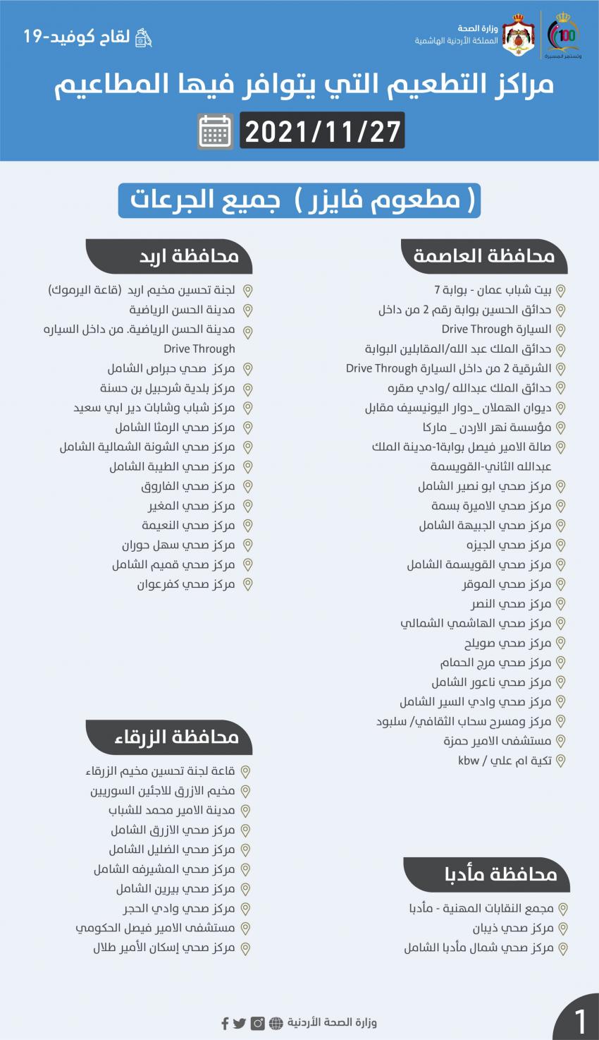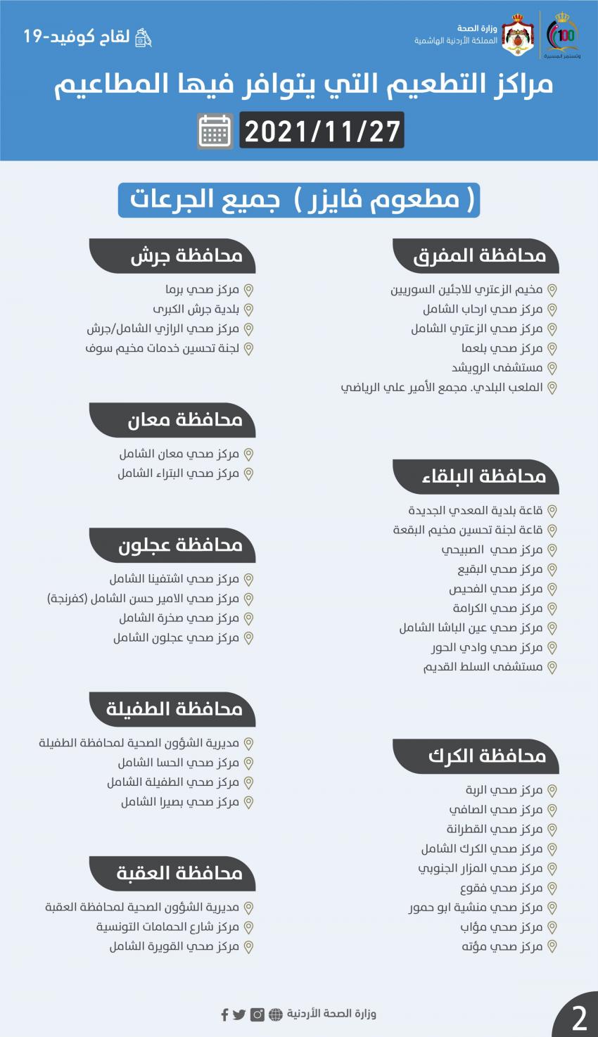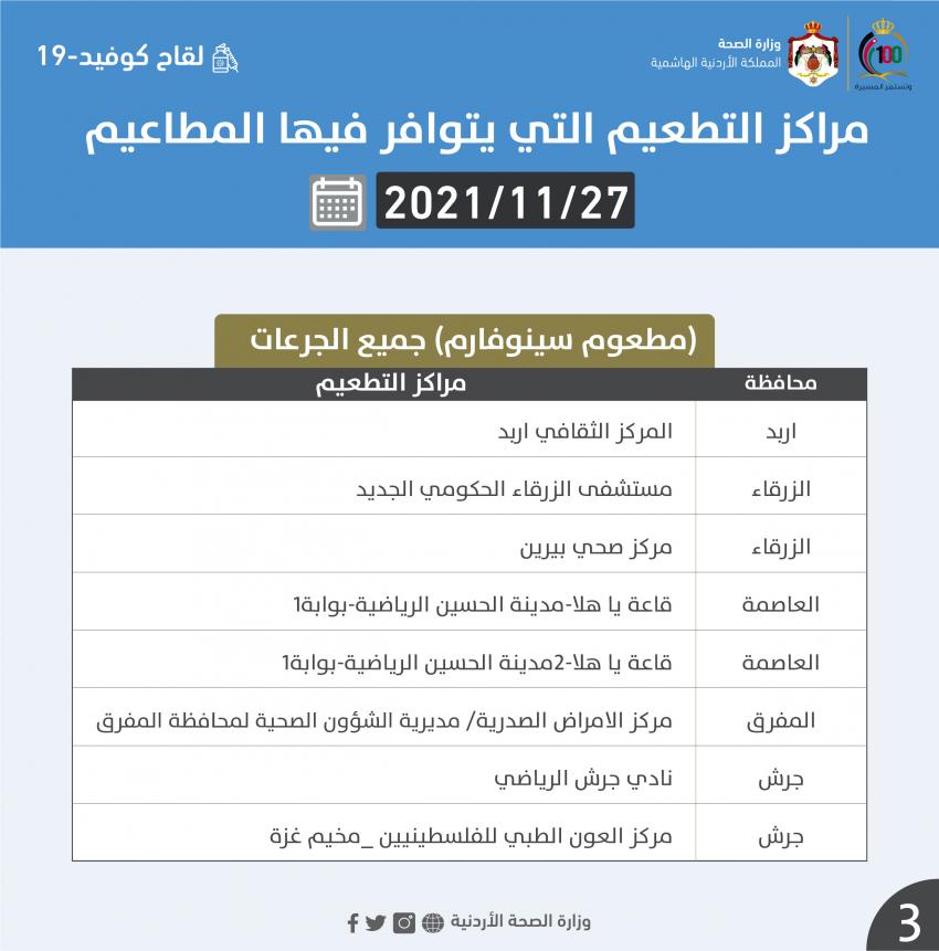 أحداث اليوم - أعلنت وزارة الصحة عن مراكز التطعيم ليوم السبت.وتاليا المراكز التي يتوافر فيها المطاعيم (لجميع الجرعات):