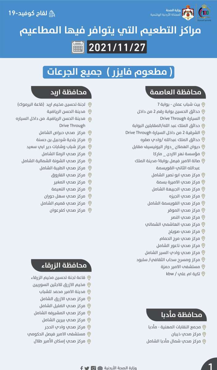 أحداث اليوم - أعلنت وزارة الصحة مراكز التطعيم التي يتوافر فيها المطاعيم "فايزر و سينوفارم" يوم السبت 27 تشرين الثاني 2021 حسب التالي: