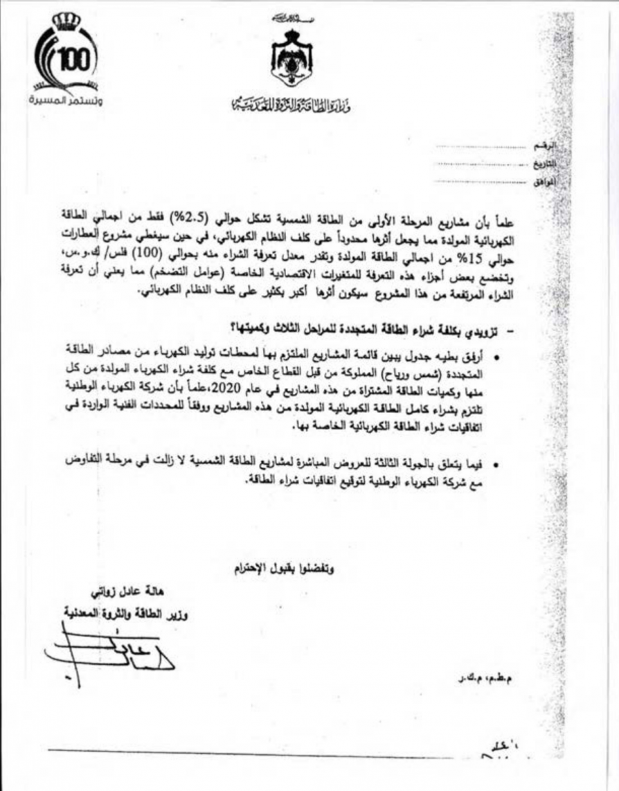 وأوضحت أن مشروع العطارات سيغطي حوالي 15% من إجمالي الطاقة المولدة، فيما تشكل مشاريع المرحلة الأولى من مشاريع الطاقة الشمسية حوالي 2.5% فقط من إجمالي الطاقة المولدة، ما يجعل أثرها محدودا على كلف النظام الكهربائي.