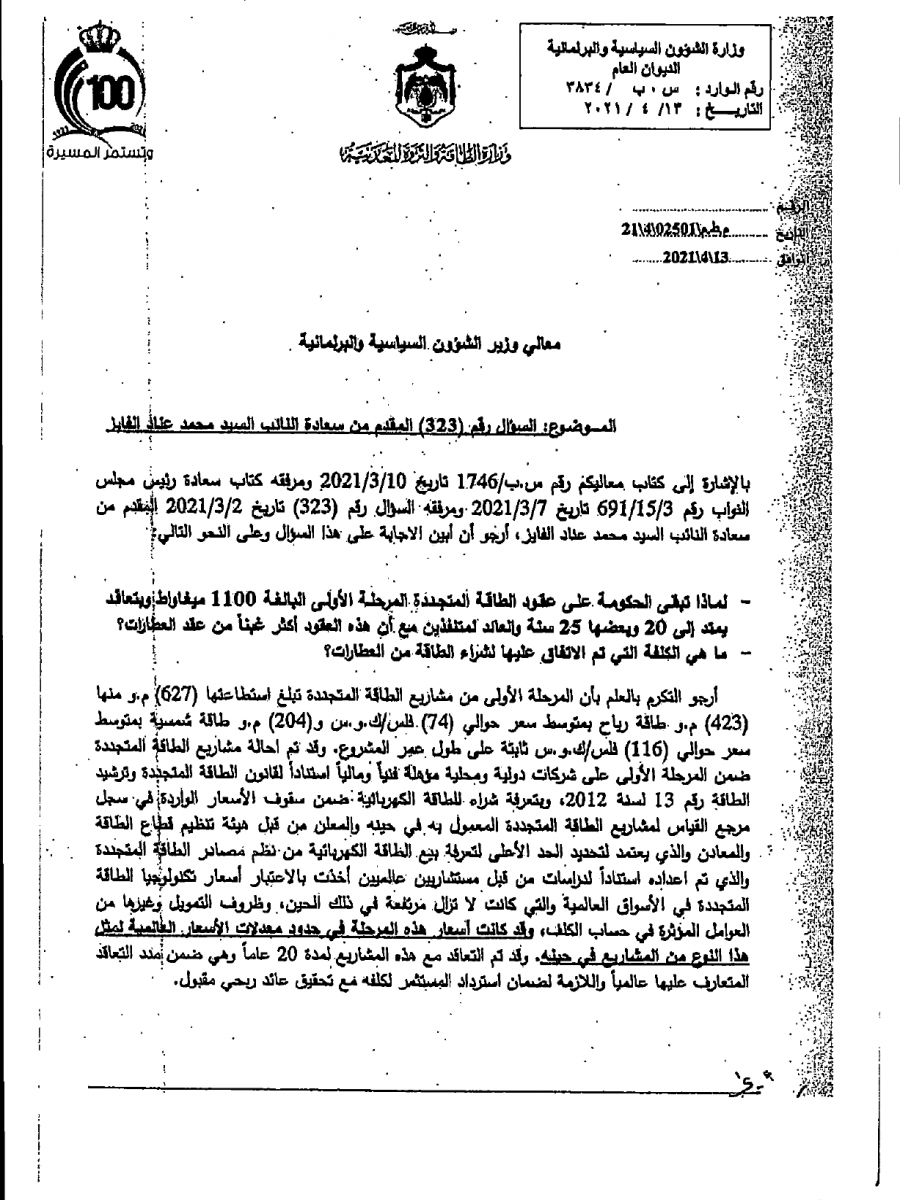 وقالت زواتي في ردها على سؤال للنائب محمد عناد الفايز أن معدل تعرفة الشراء من مشروع العطارات تقدر بحوالي 100 فلس/كيلوواط/ الساعة.