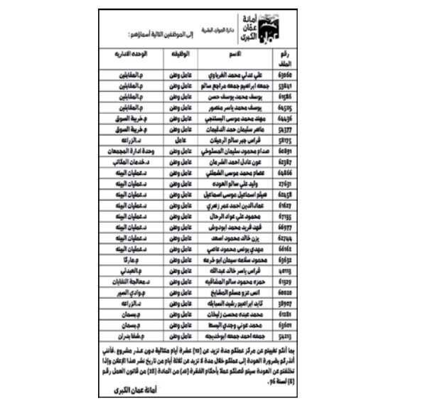 أحداث اليوم - أنذرت أمانة عمّان الكبرى، موظفين بالفصل من مواقع عملهم، بسبب تغيبهم لمدة تزيد عن 10 أيام متتالية دون عذر مشروع.