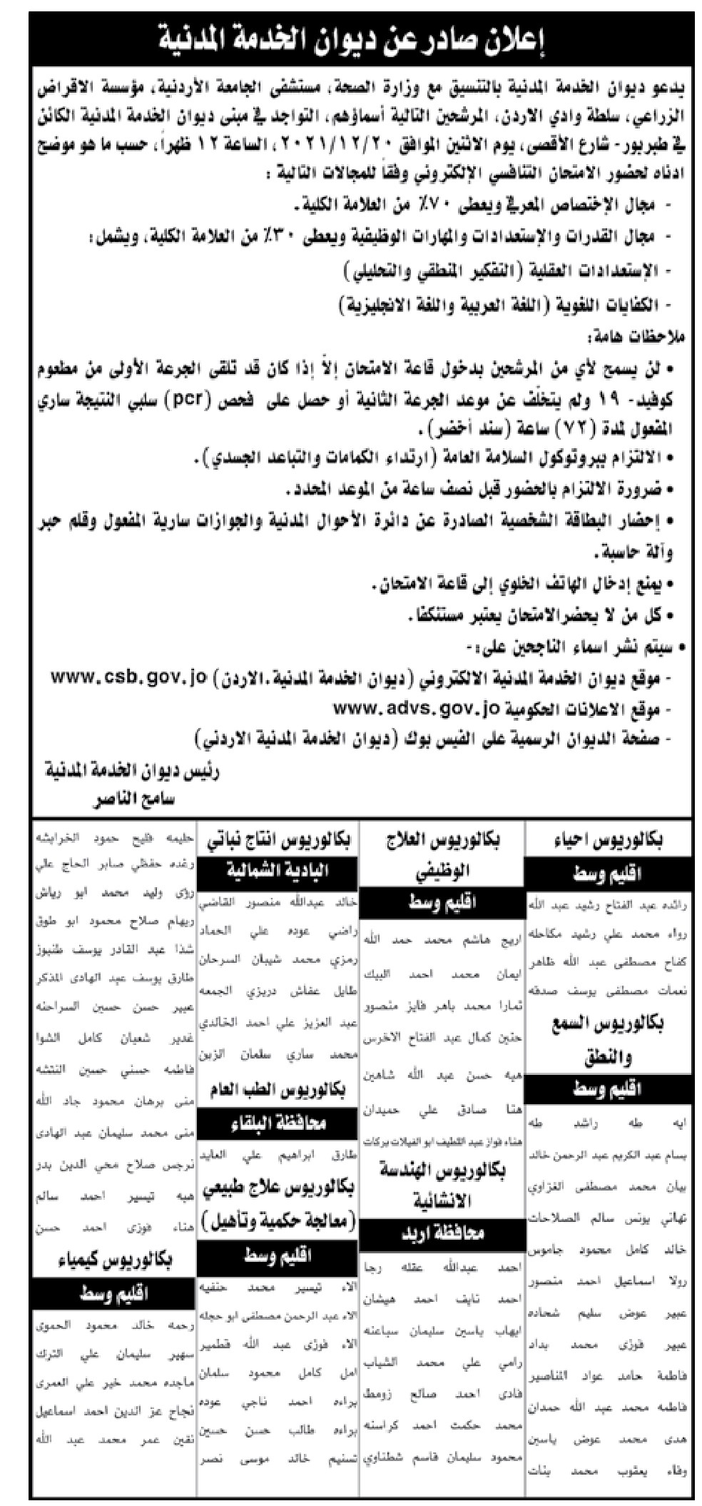 أحداث اليوم - دعا ديوان الخدمة المدنية بالتنسيق مع وزارة الصحة، ومستشفى الجامعة الأردنية، ومؤسسة الإقراض الزراعي، وسلطة وادي الأردن، مرشحين لحضور الامتحان التنافسي.