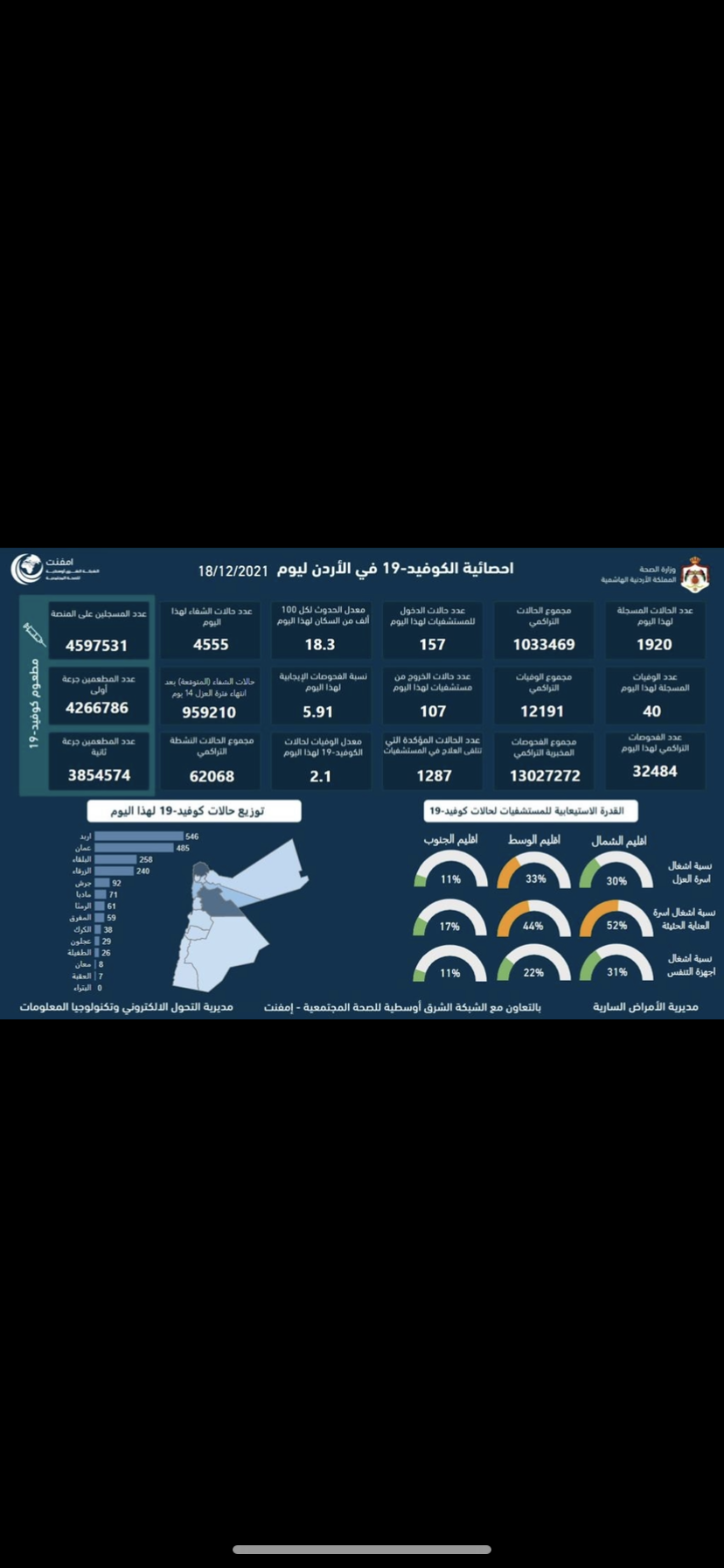 وأضاف أن نسبة إشغال أسرّة العزل في إقليم الوسط بلغت 33 بالمئة، في حين وصلت نسبة إشغال أسرّة العناية الحثيثة في الإقليم ذاته إلى 44 بالمئة، ونسبة إشغال أجهزة التنفس الاصطناعي إلى 22 بالمئة.