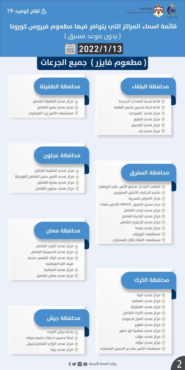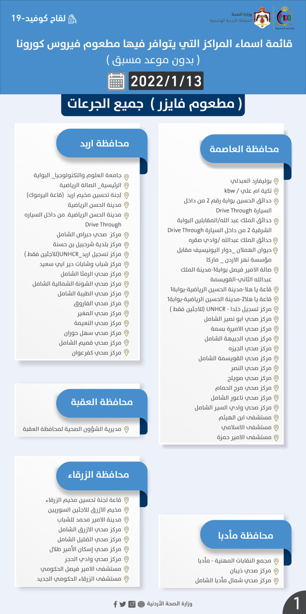 أحداث اليوم - أعلنت وزارة الصحة قائمة بأسماء المراكز التي يتوافر فيها مطعوم فيروس كورونا (بدون موعد مسبق) بجميع الجرعات ليوم الخميس الموافق 2022/1/13.وتاليا أسماء المراكز: