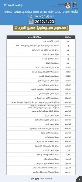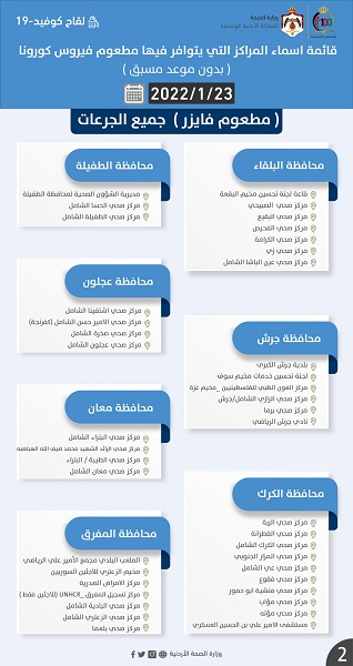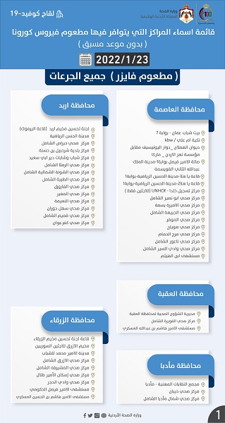 أحداث اليوم - أفصحت وزارة الصحة عن قائمة بأسماء المراكز التي يتوافر فيها مطعوم فيروس كورونا (بدون موعد مسبق) جميع الجرعات ليوم الاحد الموافق 2022/1/23:دوام مراكز المطاعيم من الساعة الثامنة صباحاً - الثالثة مساءاً مطعوم فايزرمطعوم سينوفارم