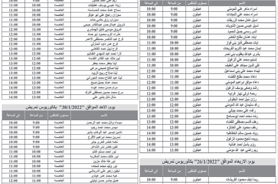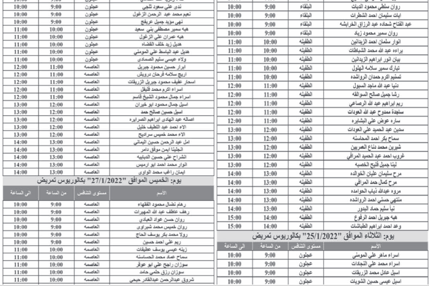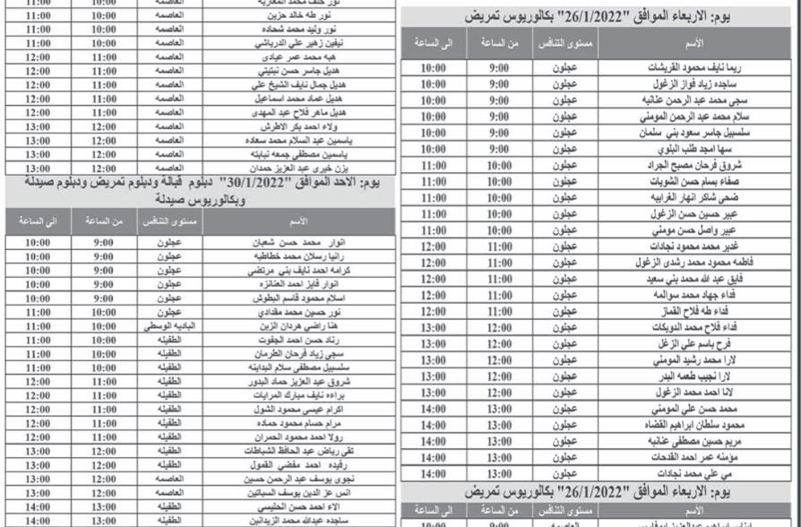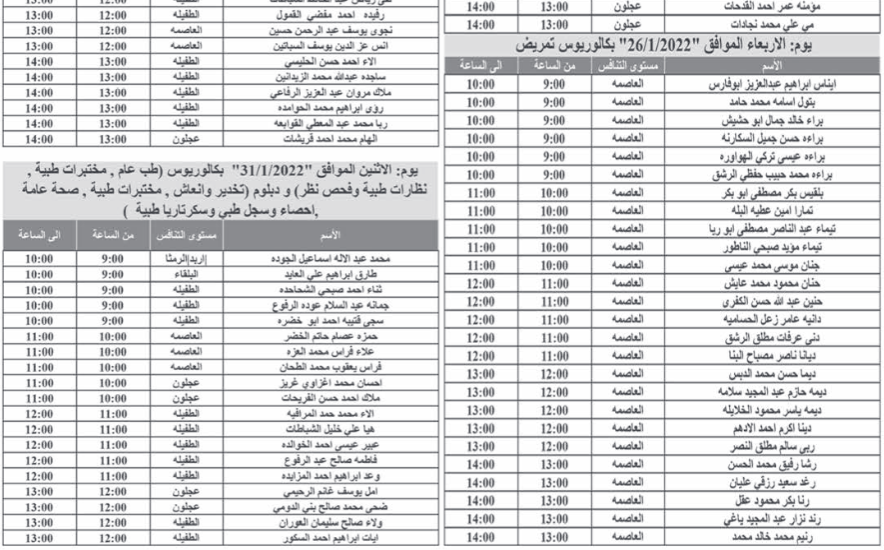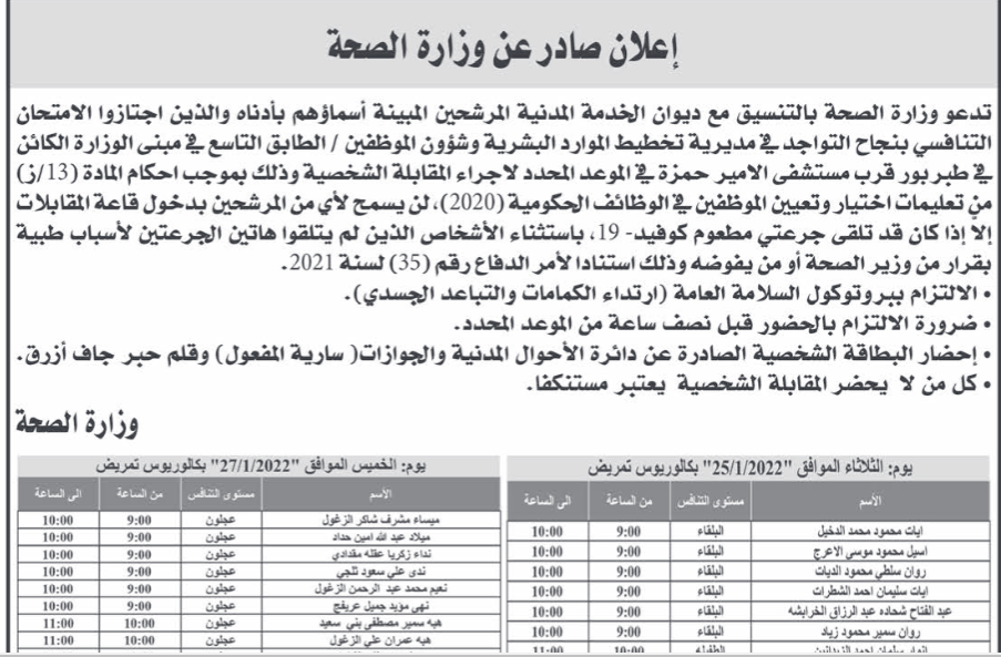 أحداث اليوم - تدعو وزارة الصحة بالتنسيق مع ديوان الخدمة المدنية المرشحين المبينة أسماؤهم والذين اجتازوا الامتحان التنافسي بنجاح التواجد في مبنى الوزارة الكائن في طبربور لإجراء المقابلة الشخصية.