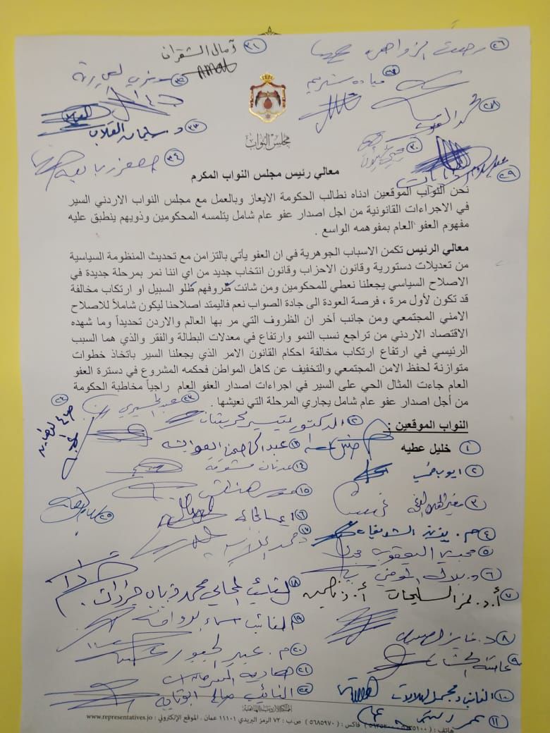 نحن النواب الموقعين ادناه نطالب الحكومة الايعاز وبالعمل مع مجلس النواب الاردني السير في الاجراءات القانونية من اجل اصدار عفو عام شامل يتلمسه المحكومين وذويهم ينطبق عليه مفهوم العفو العام بمفوهمه الواسع .