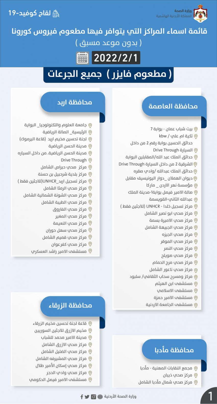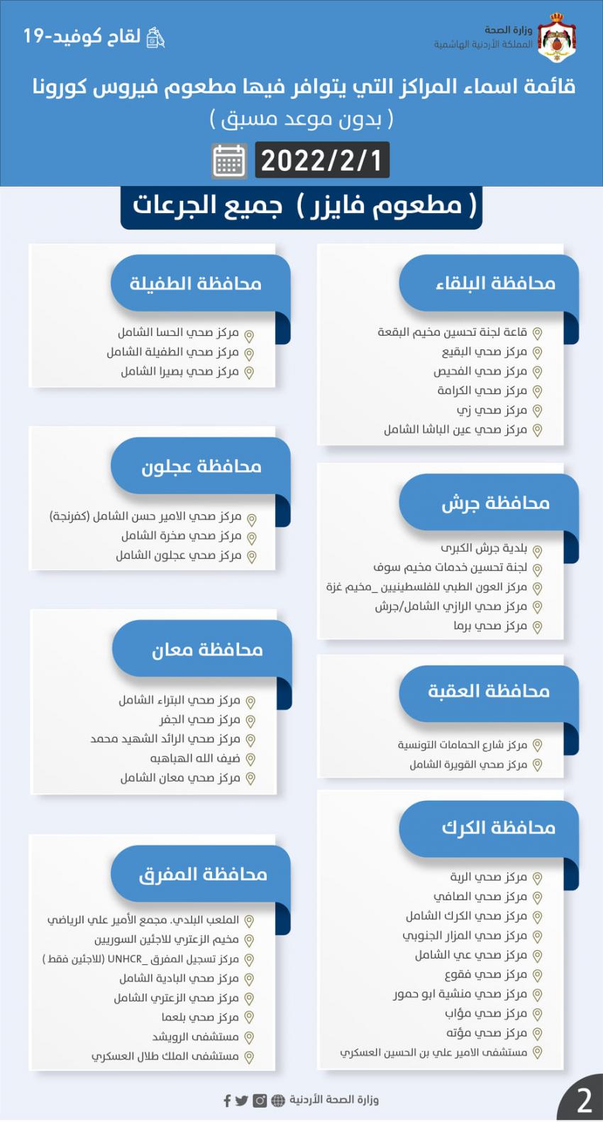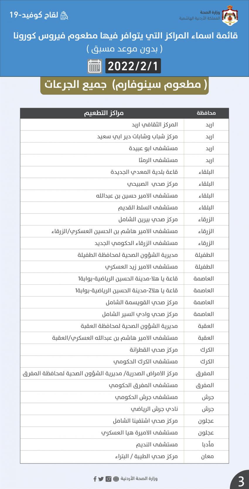 أحداث اليوم - أعلنت وزارة الصحة قائمة باسماء المراكز التي يتوافر فيها مطعوم فيروس كورونا (بدون موعد مسبق) جميع الجرعات ليوم الثلاثاء:وتاليا المراكز: