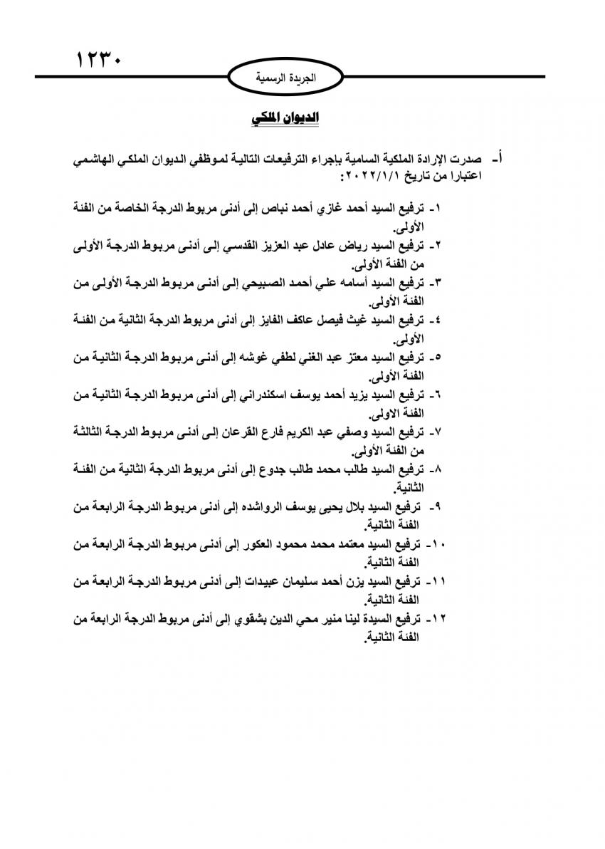أحداث اليوم - صدرت الارادة الملكية السامية بترفيع 12 موظفا في الديوان الملكي الهاشمي اعتبارا من تاريخ 1/1/2022.وتاليا الاسماء: