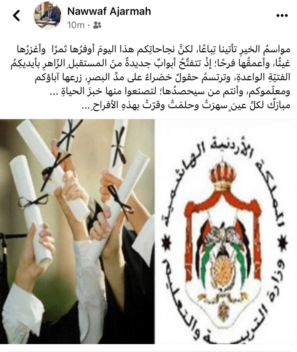 أحداث اليوم - نشر امين عام وزارة التربية والتعليم د. نواف العجارمة منشور عبر صفحته الشخصية على موقع التواصل الاجتماعي فيسبوك مهنئاً طلبة التوجيهي من خلاله قال فيه :-