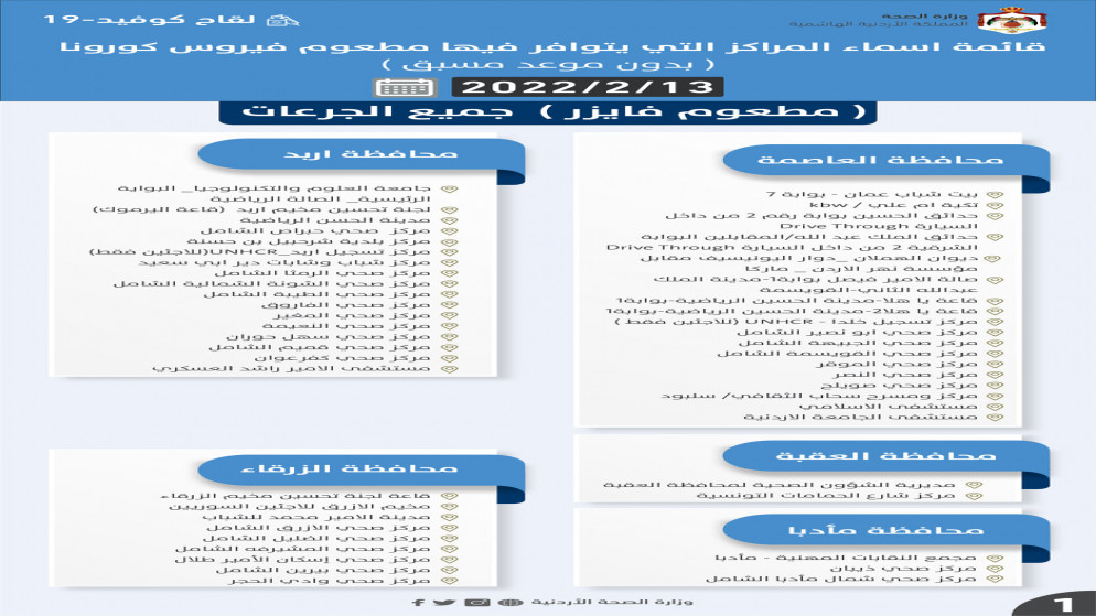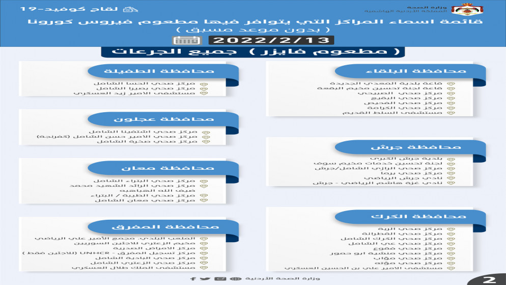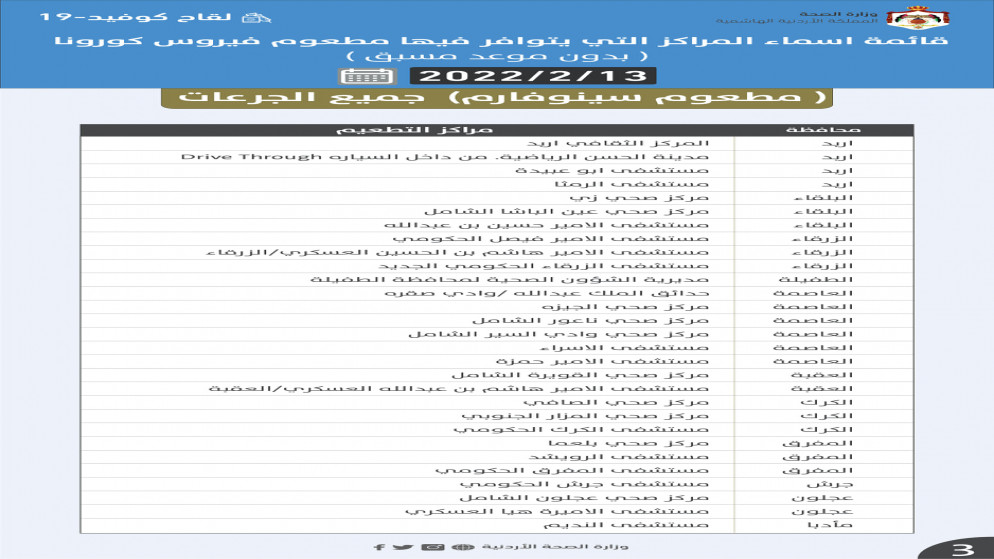 أحداث اليوم - نشرت وزارة الصحة الأحد، قائمة اسماء المراكز التي يتوافر فيها مطعوم فيروس كورونا (بدون موعد مسبق) لجرعات سينوفارم وفايز. ويبدأ دوام مراكز المطاعيم من الساعة 8:00 صباحاً وحتى 3:00 مساءً.