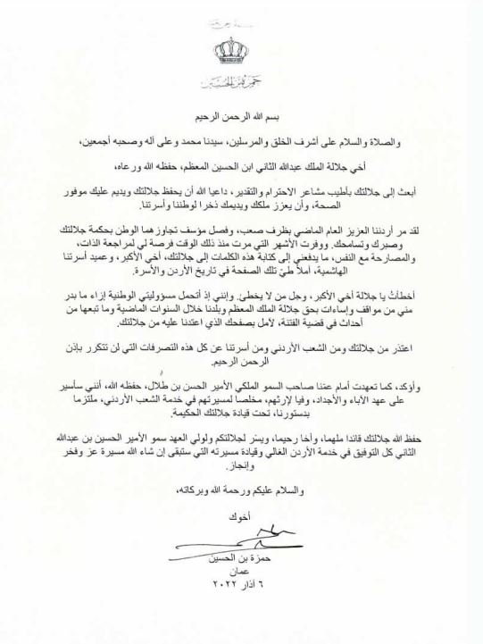 لقد مر أردننا العزيز العام الماضي بظرف صعب، وفصل مؤسف تجاوزهما الوطن بحكمة جلالتك وصبرك وتسامحك. ووفرت الأشهر التي مرت منذ ذلك الوقت فرصة لي لمراجعة الذات، والمصارحة مع النفس، ما يدفعني إلى كتابة هذه الكلمات إلى جلالتك، أخي الأكبر، وعميد أسرتنا الهاشمية، آملاً طيّ تلك الصفحة في تاريخ الأردن والأسرة.