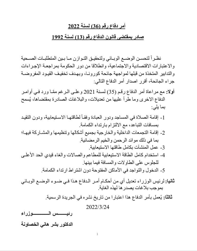 أحداث اليوم - أصدر رئيس الوزراء الدكتور بشر الخصاونة اليوم، امر الدفاع رقم (٣٦) بهدف تخفيف القيود المفروضة جراء جائحة كورونا.