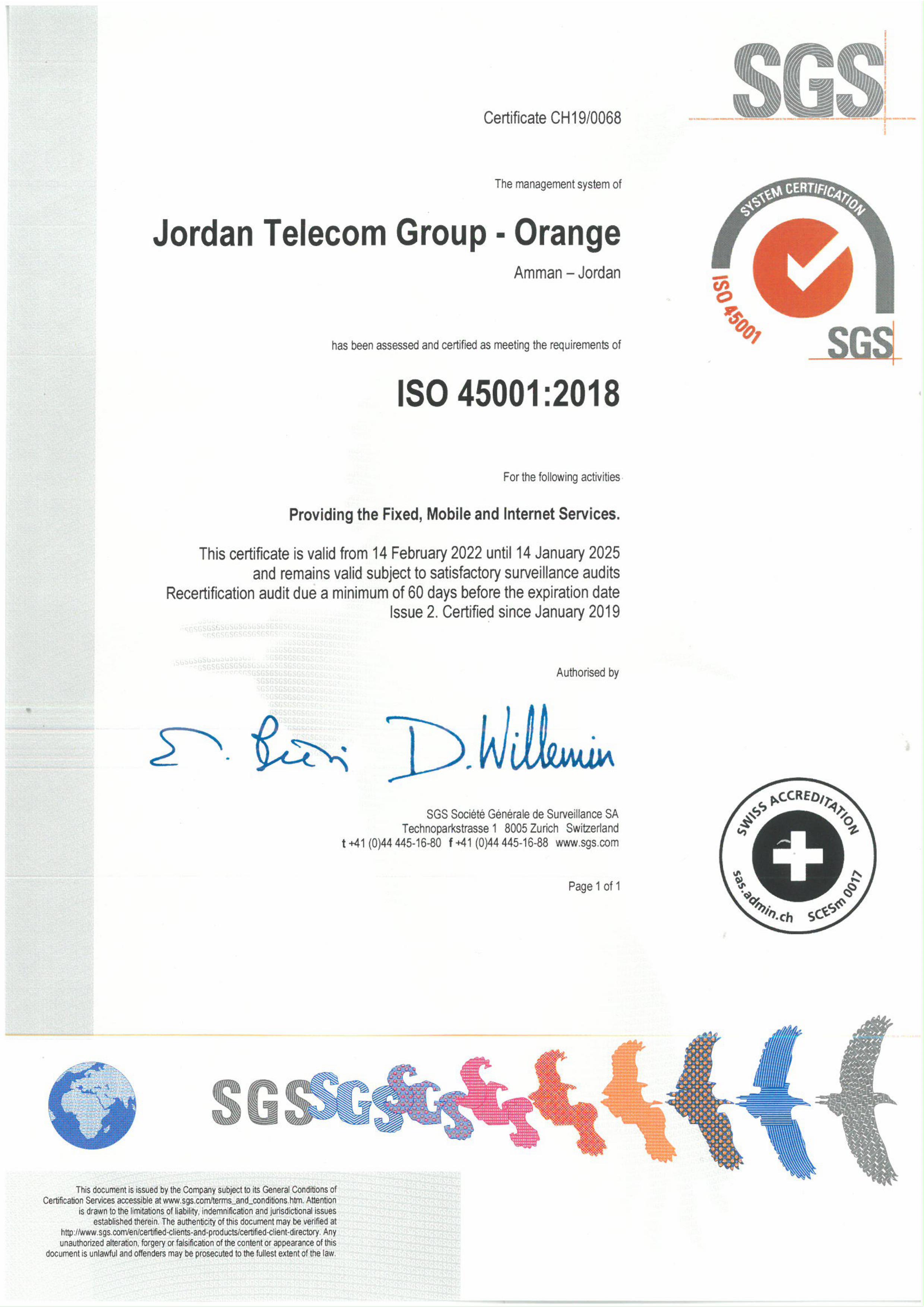 حصلت أورنج الأردن للمرة الثانية على التوالي على شهادة الأيزو (ISO 45001:2018) لأنظمة إدارة السلامة والصحة المهنية وشهادة (ISO 14001:2015) ذات الصلة بمعايير نظام إدارة البيئة، وذلك بعد أن أتمت الشركة المتطلبات والمواصفات المعتمدة لاستحقاق هذه الشهادات العالمية الهامّة، من خلال حرصها الدائم على ضمان بيئة عمل نموذجية.