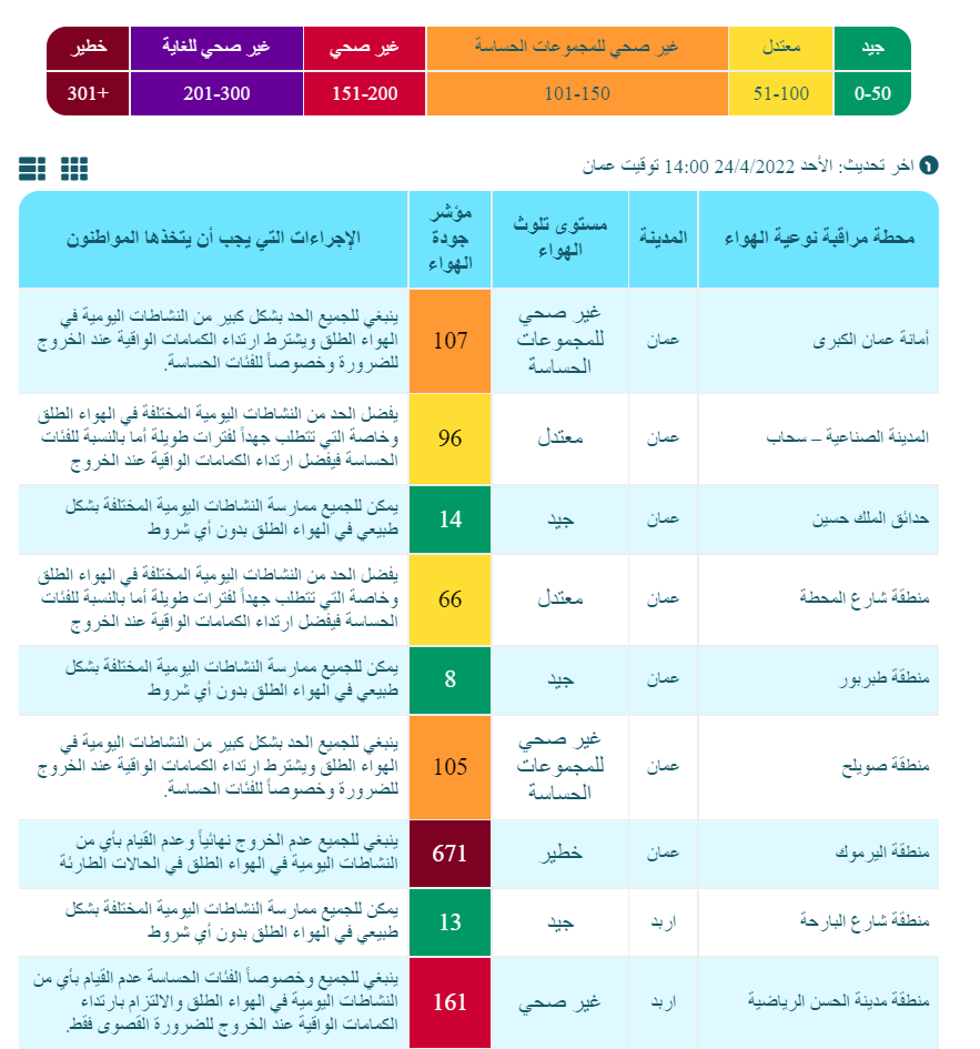 أحداث اليوم - نشرت وزارة البيئة، الأحد، مؤشرات جودة الهواء المقاسة من محطات رصد الهواء المحيط التابعة للوزارة في كل من عمّان وإربد و الزرقاء.