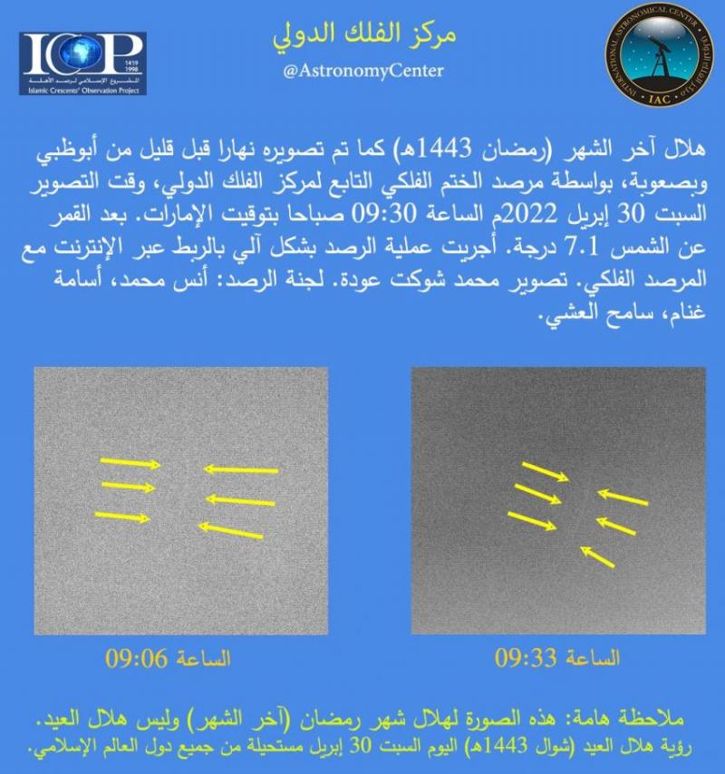أحداث اليوم - نشر مركز الفلك الدولي صباح اليوم السبت صورة هلال اخر شهر رمضان المبارك لعام 1443هـ.